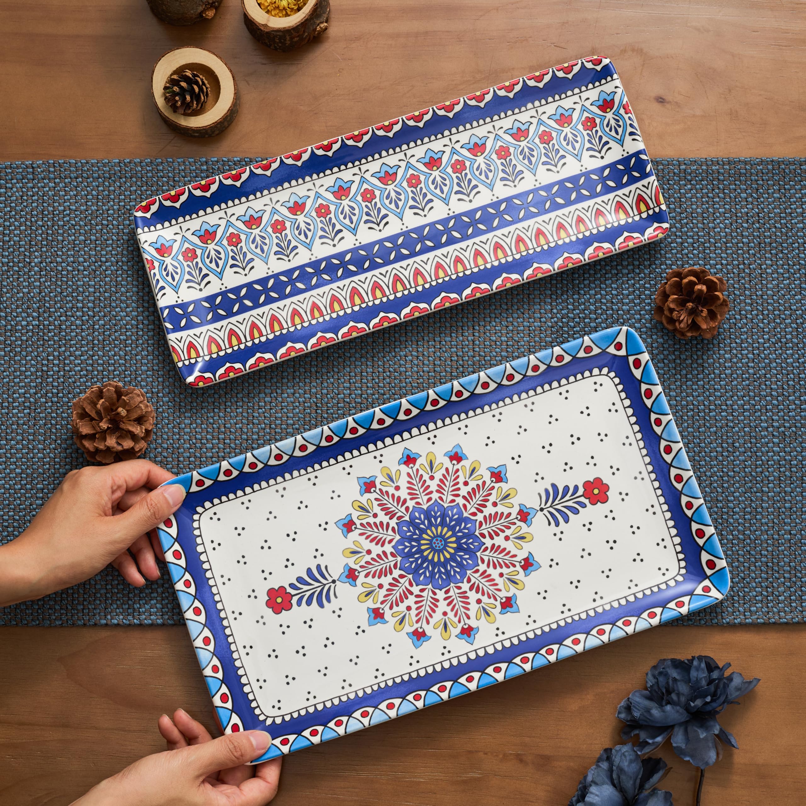 Bico Boho Totem Ceramic 14 inch Rectangular Serving Platter, Set of 2, for Serving Salad, Pasta, Cheese, Ham, Appetizer, Microwave & Dishwasher Safe