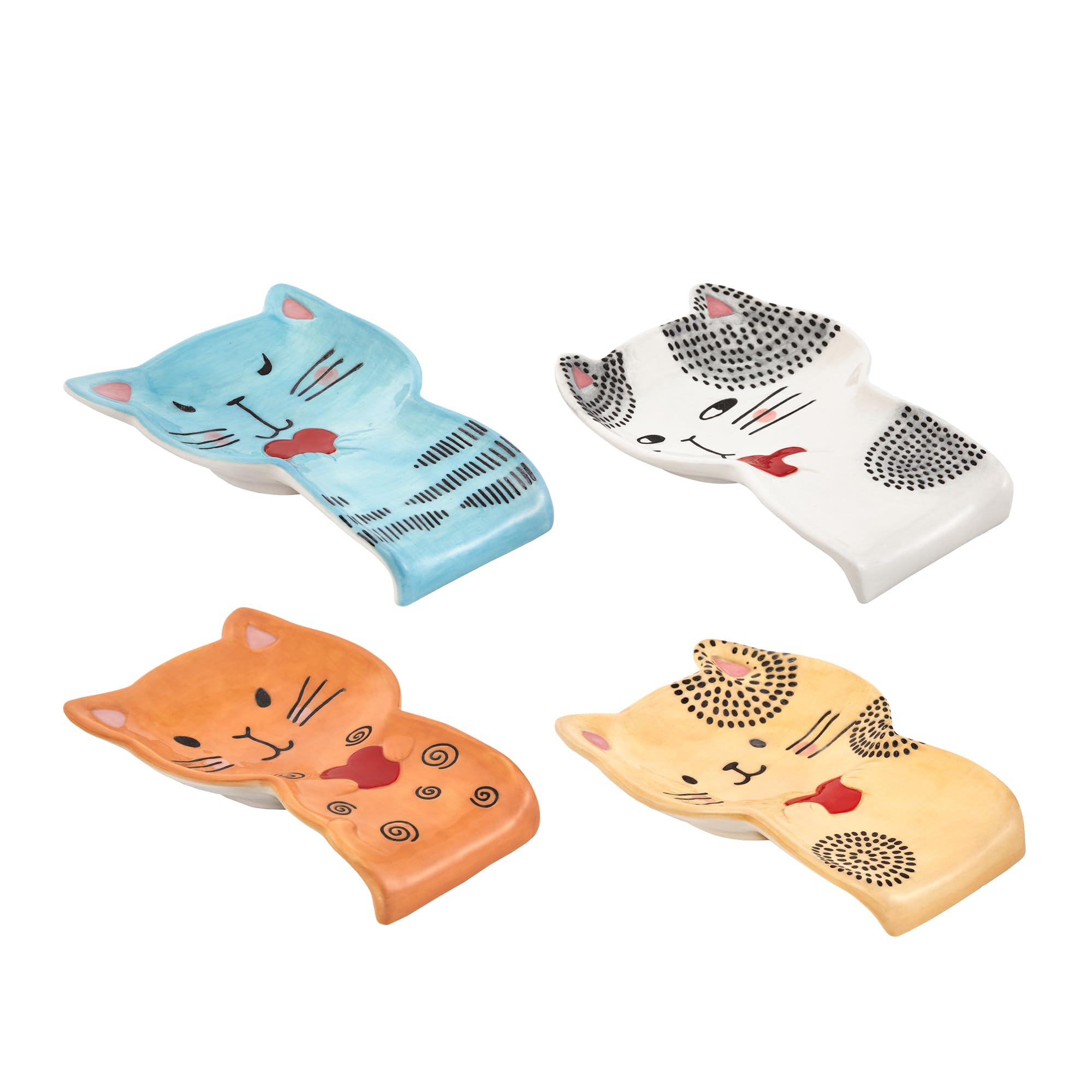 Bico Cartoon Cat Valentine's Day Handpainted Stoneware Spoon Rest Set, Set of 4, Microwave & Dishwasher Safe, for holding spoon, spatula, cookeware