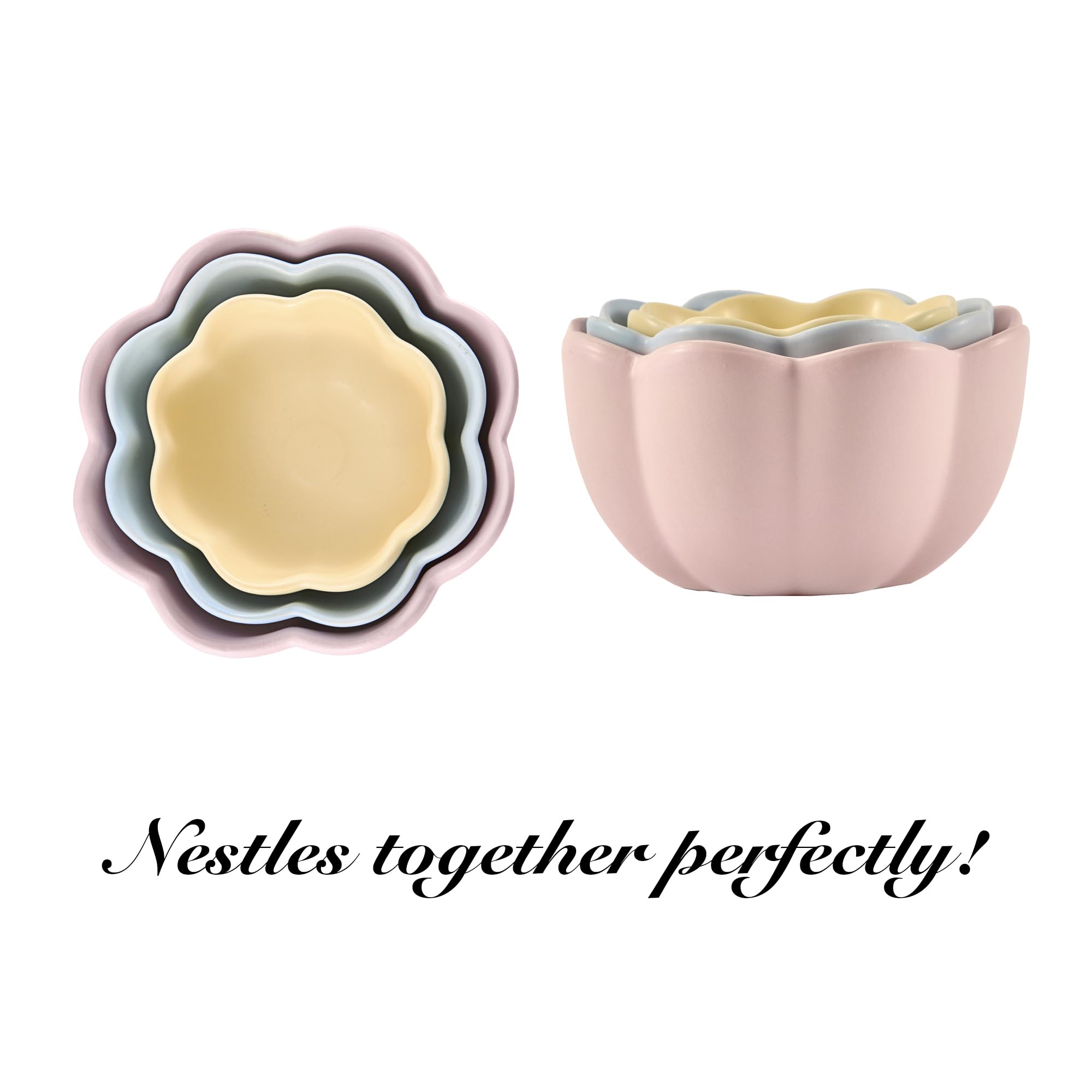 Bico Flower Shaped Ceramic Handcrafted Mixing Bowl Set of 3, Microwave & Dishwasher Safe, for Baking, Cooking, Food Prep