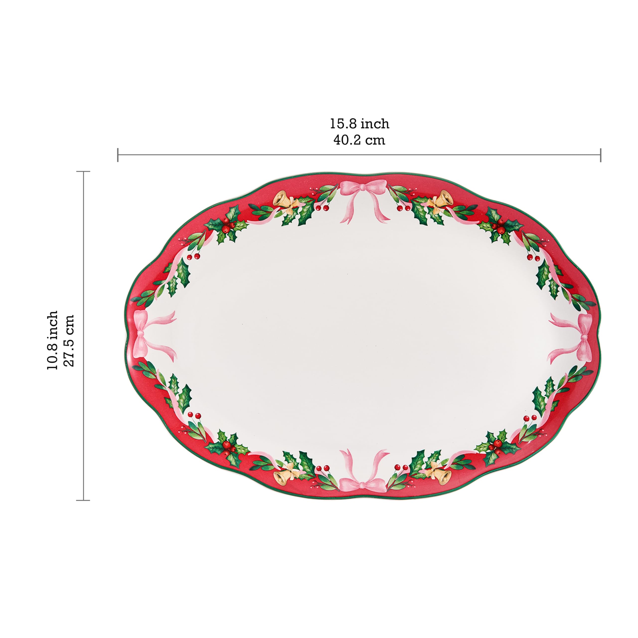 Bico Ribbon Christmas Scalloped 16 plus 14 inch Ceramic Oval Platters Set, Set of 2, Microwave & Dishwasher Safe, for Serving Fish, Chicken, Turkey